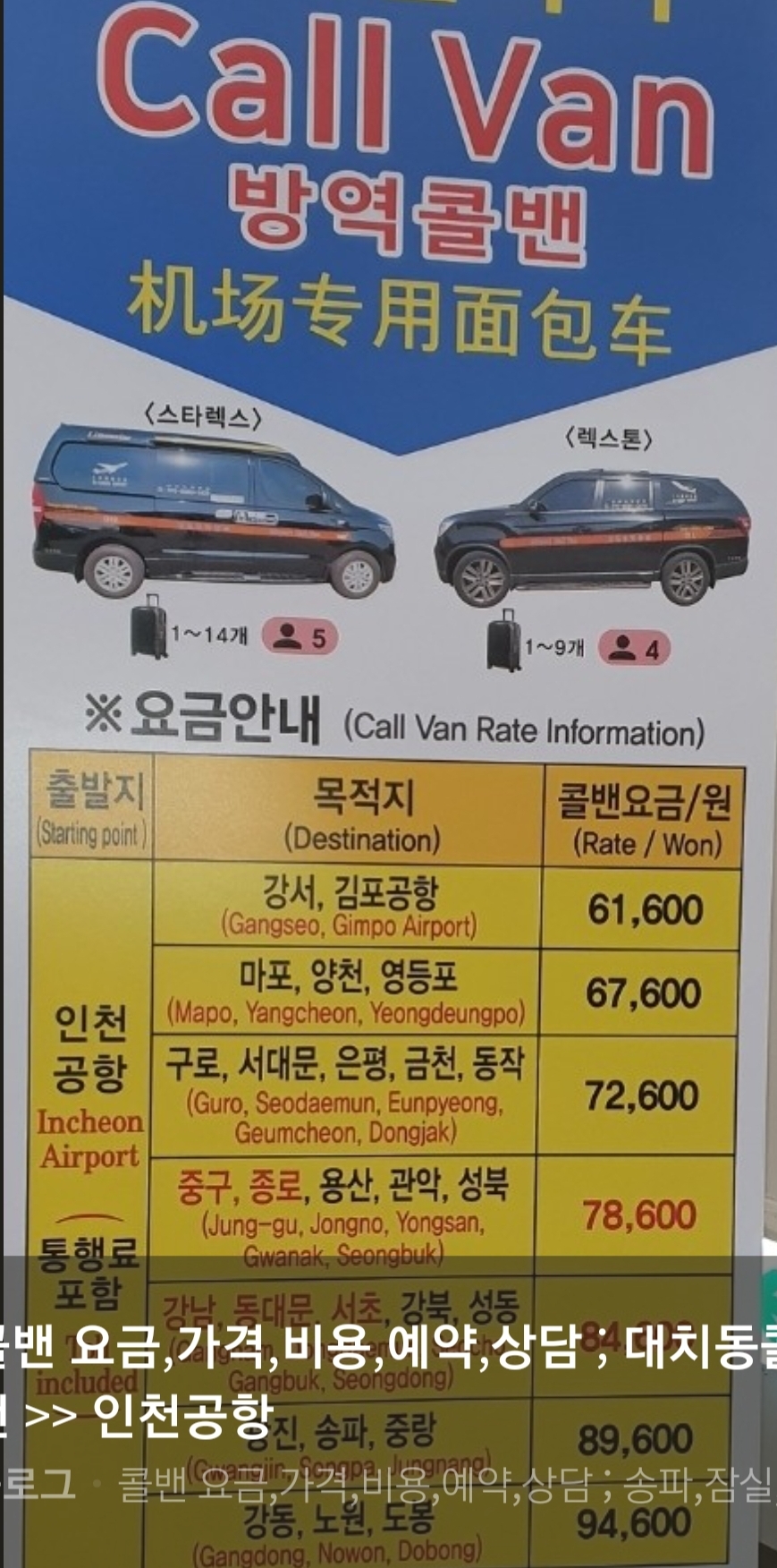 콜밴 요금 : 송파콜밴 >> 인천공항 24시운행 콜밴