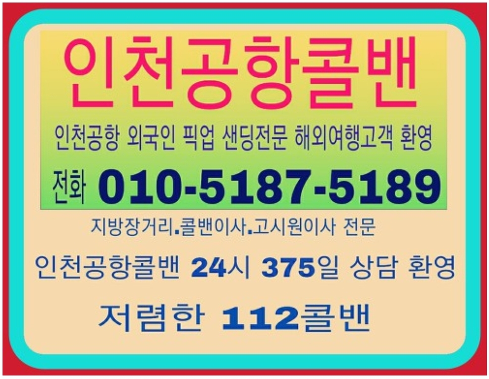 콜밴가격 요금 비용을 문의시 010-5187-5189로 문의 주시면 언제든 상담 가능 합니다. 인천공항콜밴의 편리함점 스타리아,스타렉스,렉스텬스포츠 콜밴으로 이민가방 큰 것 7개정도의 짐과 함께 5분의 고객님이 탑승가능 목적지까지 안전하고 편안하게 이동 해드립니다.콜밴은 미리 예약 하기거나 1시간전에 예약주시면 이용할 가능 합니다.미리 출발 예약할때 문자나 카톡 주시면 시간 약속 10분전에 원하시는 대기 합니다. ★인천공항콜밴의 업무★의료관공 성형외과 호텔 게스트하우스★ 내국인 외국인 공항 픽업 센딩.★외국인픽업 ★외국인 피켓 픽업 ★외국인 센딩★외국인 호텔 픽업 &샌딩 ★인천공항 예약 ★인천공항 서비스 ★콜밴은 고시원이사 지방장거리전문 소형이사 친절 기사님이 24시 대기 합니다.★가족들 지인들 회사 모임 골프장 지방장거리 등 짐이 많은 경우 이동 예약 됩니다.★모든차량은 인원에따라 가격 및 요금 예약 문이 하세요.★고속터미널에서 택시타기 힘든 짐량을 이동 집,회사,원하시는 목적지까지 이동 가능 합니다.★짐을 들고 호텔이나 관광지 ktx 이동시 가능 합니다.★케리어 등 당일 이동 택배 가능 합니다. ★고객님 혹은 지인 가족의병원 입/퇴원시 짐이 많을 때 이용 예약 가능 합니다 ★고객님과 함께 애완 동물 장거리 이동시 이용 가격문의 예약 가능 합니다. ★인천공항콜밴(pick-up) &인천공항콜밴요금(sending) 서비스★ 인천공항콜밴가격 picket pick-up &sending 서비스 ★ 인천공항콜밴 예약 ★ 인천공항콜밴 문의 ★ 인천공항콜밴 24시 상담★ 인천공항콜밴 외국인 픽업 샌딩 ★ 인천공항콜밴 지방장거리운행 서비스 타타 경기도콜밴》 인천공항콜밴은 항상 고객을 정성껏 목적지까지 모시는 인천공항까지 이용 베테량 30년무사고 친절한기사님이 최고의 서비스로 모십니다. 콜밴 이용 안내 .미리 예약필수 혹시 예약 사전에 안하셨다면 적어도 1시간전에 예약 전화주시면 부담없이 이용 가능 합니다.. .용달트럭으로 이동하기는 많지안은짐 가구없이 소량으로 원룸이사,고시원이사를 원하시면 미리예약 하시면 콜밴 편리하고 안전하게 이용하세요. .콜밴요금은 고객님과 미리 가격을 상담 협의금액으로 (예약시 정해진 금액) 운행합니다. .콜밴가격은 기본 4만원(5Km)에 (대기시간요금)1시간 * 3만원 운행거리에 표시된 요금표되로 장거리운행시 합의측정된 금액으로 이용 가능 합니다 (통행료별도,대가시간등 감안) 추가분금액은 별도로 지불 책정 합니다. .365일 24시 연중무휴,휴일에도 인천공항콜밴은 평일과 동일 상시 예약 운행 합니다. .야간 21시부터 익일04시이용시 1~2만원 추가 됩니다. .인천공항픽켓픽업서비스 이용시:10,000원추가(피켓,주차비등감안) 가격 추가 합니다 .당일왕복요금은 대기시간이 1시간이내일경우 편도와 동일 금액입니다. .30분후 대기료는 시간당 3만원입니다.