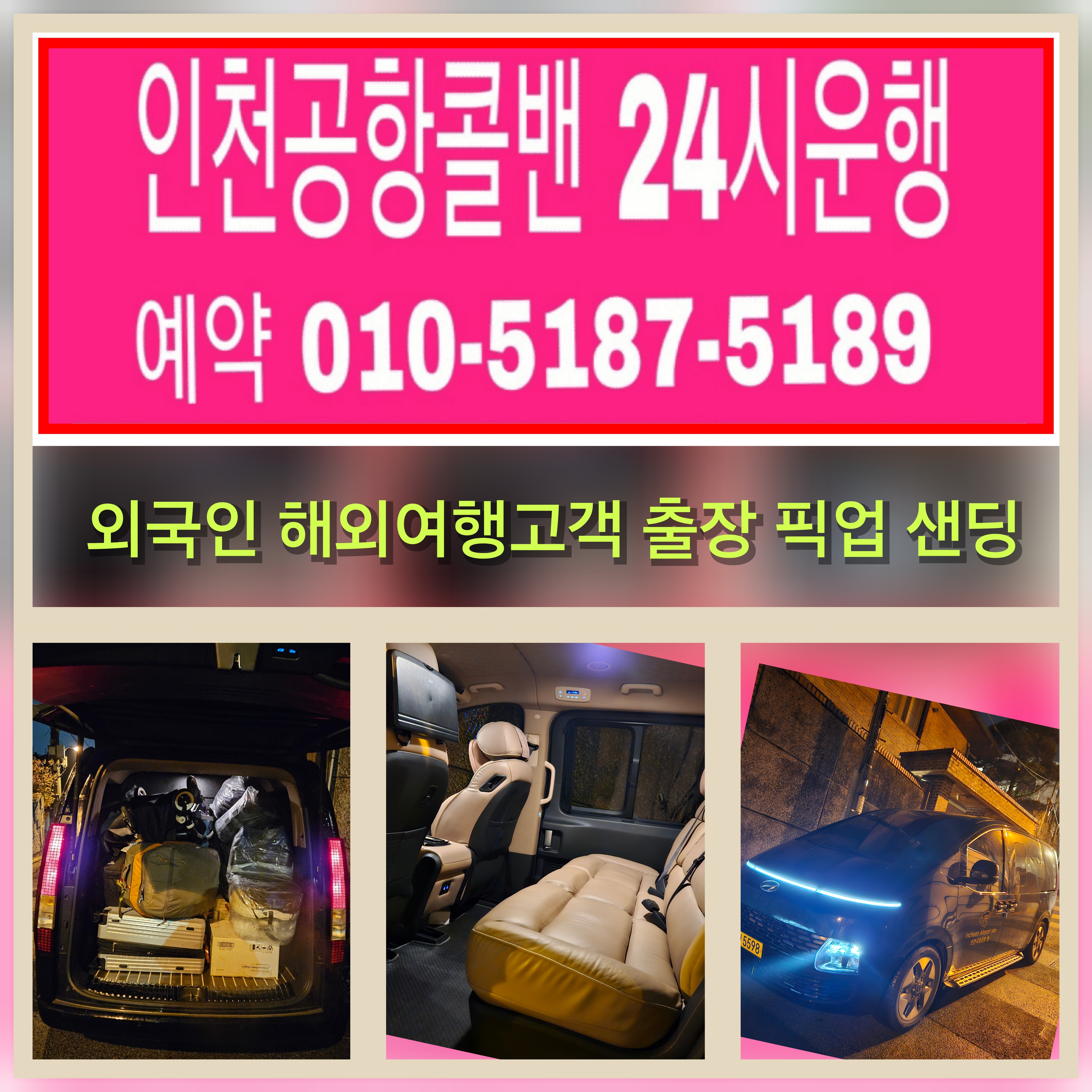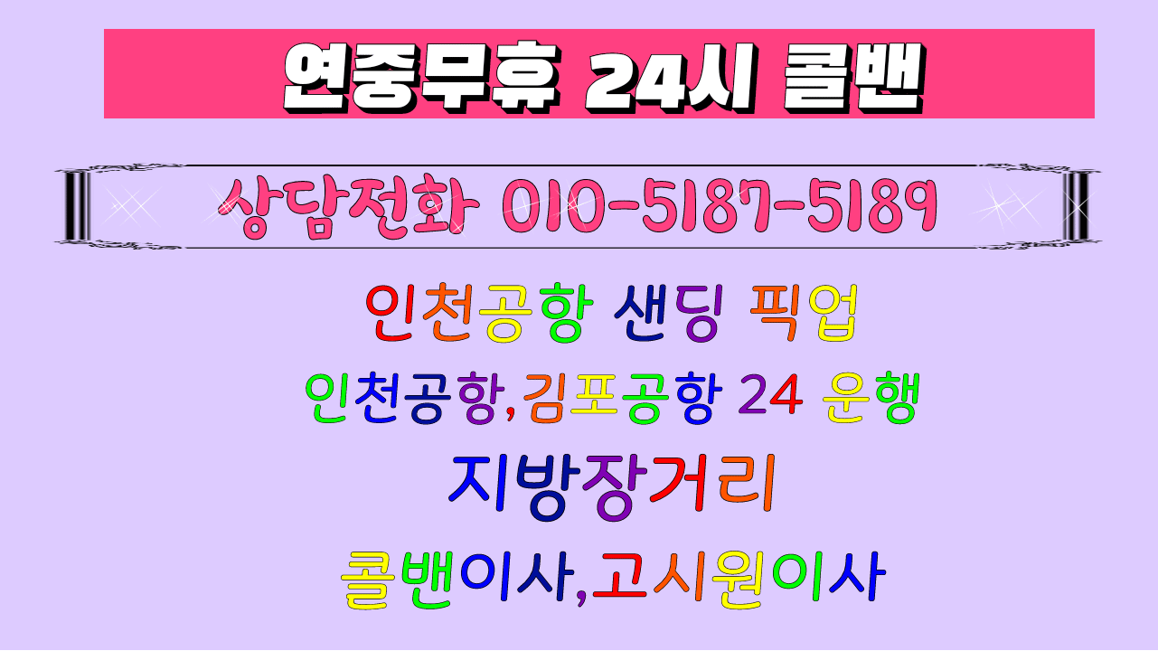 콜밴가격 요금 비용을 문의시 010-5187-5189로 문의 주시면 언제든 상담 가능 합니다. 인천공항콜밴의 편리함점 스타리아,스타렉스,렉스텬스포츠 콜밴으로 이민가방 큰 것 7개정도의 짐과 함께 5분의 고객님이 탑승가능 목적지까지 안전하고 편안하게 이동 해드립니다.콜밴은 미리 예약 하기거나 1시간전에 예약주시면 이용할 가능 합니다.미리 출발 예약할때 문자나 카톡 주시면 시간 약속 10분전에 원하시는 대기 합니다. ★인천공항콜밴의 업무★의료관공 성형외과 호텔 게스트하우스★ 내국인 외국인 공항 픽업 센딩.★외국인픽업 ★외국인 피켓 픽업 ★외국인 센딩★외국인 호텔 픽업 &샌딩 ★인천공항 예약 ★인천공항 서비스 ★콜밴은 고시원이사 지방장거리전문 소형이사 친절 기사님이 24시 대기 합니다.★가족들 지인들 회사 모임 골프장 지방장거리 등 짐이 많은 경우 이동 예약 됩니다.★모든차량은 인원에따라 가격 및 요금 예약 문이 하세요.★고속터미널에서 택시타기 힘든 짐량을 이동 집,회사,원하시는 목적지까지 이동 가능 합니다.★짐을 들고 호텔이나 관광지 ktx 이동시 가능 합니다.★케리어 등 당일 이동 택배 가능 합니다. ★고객님 혹은 지인 가족의병원 입/퇴원시 짐이 많을 때 이용 예약 가능 합니다 ★고객님과 함께 애완 동물 장거리 이동시 이용 가격문의 예약 가능 합니다. ★인천공항콜밴(pick-up) &인천공항콜밴요금(sending) 서비스★ 인천공항콜밴가격 picket pick-up &sending 서비스 ★ 인천공항콜밴 예약 ★ 인천공항콜밴 문의 ★ 인천공항콜밴 24시 상담★ 인천공항콜밴 외국인 픽업 샌딩 ★ 인천공항콜밴 지방장거리운행 서비스 타타 경기도콜밴》 인천공항콜밴은 항상 고객을 정성껏 목적지까지 모시는 인천공항까지 이용 베테량 30년무사고 친절한기사님이 최고의 서비스로 모십니다. 콜밴 이용 안내 .미리 예약필수 혹시 예약 사전에 안하셨다면 적어도 1시간전에 예약 전화주시면 부담없이 이용 가능 합니다.. .용달트럭으로 이동하기는 많지안은짐 가구없이 소량으로 원룸이사,고시원이사를 원하시면 미리예약 하시면 콜밴 편리하고 안전하게 이용하세요. .콜밴요금은 고객님과 미리 가격을 상담 협의금액으로 (예약시 정해진 금액) 운행합니다. .콜밴가격은 기본 4만원(5Km)에 (대기시간요금)1시간 * 3만원 운행거리에 표시된 요금표되로 장거리운행시 합의측정된 금액으로 이용 가능 합니다 (통행료별도,대가시간등 감안) 추가분금액은 별도로 지불 책정 합니다. .365일 24시 연중무휴,휴일에도 인천공항콜밴은 평일과 동일 상시 예약 운행 합니다. .야간 21시부터 익일04시이용시 1~2만원 추가 됩니다. .인천공항픽켓픽업서비스 이용시:10,000원추가(피켓,주차비등감안) 가격 추가 합니다 .당일왕복요금은 대기시간이 1시간이내일경우 편도와 동일 금액입니다. .30분후 대기료는 시간당 3만원입니다.