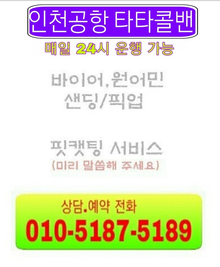콜밴가격 요금 비용을 문의시 010-5187-5189로 문의 주시면 언제든 상담 가능 합니다. 인천공항콜밴의 편리함점 스타리아,스타렉스,렉스텬스포츠 콜밴으로 이민가방 큰 것 7개정도의 짐과 함께 5분의 고객님이 탑승가능 목적지까지 안전하고 편안하게 이동 해드립니다.콜밴은 미리 예약 하기거나 1시간전에 예약주시면 이용할 가능 합니다.미리 출발 예약할때 문자나 카톡 주시면 시간 약속 10분전에 원하시는 대기 합니다. ★인천공항콜밴의 업무★의료관공 성형외과 호텔 게스트하우스★ 내국인 외국인 공항 픽업 센딩.★외국인픽업 ★외국인 피켓 픽업 ★외국인 센딩★외국인 호텔 픽업 &샌딩 ★인천공항 예약 ★인천공항 서비스 ★콜밴은 고시원이사 지방장거리전문 소형이사 친절 기사님이 24시 대기 합니다.★가족들 지인들 회사 모임 골프장 지방장거리 등 짐이 많은 경우 이동 예약 됩니다.★모든차량은 인원에따라 가격 및 요금 예약 문이 하세요.★고속터미널에서 택시타기 힘든 짐량을 이동 집,회사,원하시는 목적지까지 이동 가능 합니다.★짐을 들고 호텔이나 관광지 ktx 이동시 가능 합니다.★케리어 등 당일 이동 택배 가능 합니다. ★고객님 혹은 지인 가족의병원 입/퇴원시 짐이 많을 때 이용 예약 가능 합니다 ★고객님과 함께 애완 동물 장거리 이동시 이용 가격문의 예약 가능 합니다. ★인천공항콜밴(pick-up) &인천공항콜밴요금(sending) 서비스★ 인천공항콜밴가격 picket pick-up &sending 서비스 ★ 인천공항콜밴 예약 ★ 인천공항콜밴 문의 ★ 인천공항콜밴 24시 상담★ 인천공항콜밴 외국인 픽업 샌딩 ★ 인천공항콜밴 지방장거리운행 서비스 타타 경기도콜밴》 인천공항콜밴은 항상 고객을 정성껏 목적지까지 모시는 인천공항까지 이용 베테량 30년무사고 친절한기사님이 최고의 서비스로 모십니다. 콜밴 이용 안내 .미리 예약필수 혹시 예약 사전에 안하셨다면 적어도 1시간전에 예약 전화주시면 부담없이 이용 가능 합니다.. .용달트럭으로 이동하기는 많지안은짐 가구없이 소량으로 원룸이사,고시원이사를 원하시면 미리예약 하시면 콜밴 편리하고 안전하게 이용하세요. .콜밴요금은 고객님과 미리 가격을 상담 협의금액으로 (예약시 정해진 금액) 운행합니다. .콜밴가격은 기본 4만원(5Km)에 (대기시간요금)1시간 * 3만원 운행거리에 표시된 요금표되로 장거리운행시 합의측정된 금액으로 이용 가능 합니다 (통행료별도,대가시간등 감안) 추가분금액은 별도로 지불 책정 합니다. .365일 24시 연중무휴,휴일에도 인천공항콜밴은 평일과 동일 상시 예약 운행 합니다. .야간 21시부터 익일04시이용시 1~2만원 추가 됩니다. .인천공항픽켓픽업서비스 이용시:10,000원추가(피켓,주차비등감안) 가격 추가 합니다 .당일왕복요금은 대기시간이 1시간이내일경우 편도와 동일 금액입니다. .30분후 대기료는 시간당 3만원입니다.