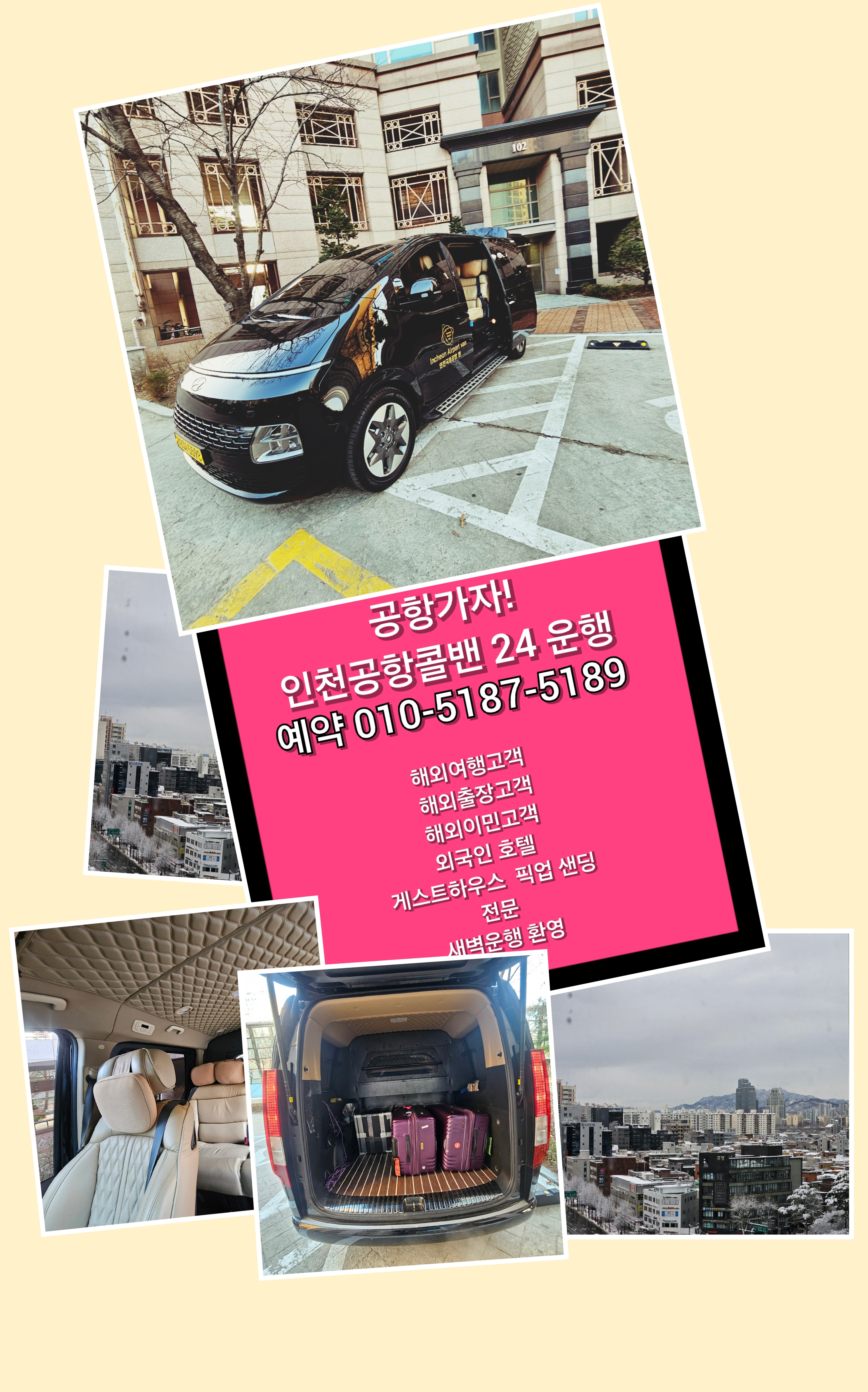 콜밴가격 요금 비용을 문의시 010-5187-5189로 문의 주시면 언제든 상담 가능 합니다. 인천공항콜밴의 편리함점 스타리아,스타렉스,렉스텬스포츠 콜밴으로 이민가방 큰 것 7개정도의 짐과 함께 5분의 고객님이 탑승가능 목적지까지 안전하고 편안하게 이동 해드립니다.콜밴은 미리 예약 하기거나 1시간전에 예약주시면 이용할 가능 합니다.미리 출발 예약할때 문자나 카톡 주시면 시간 약속 10분전에 원하시는 대기 합니다. ★인천공항콜밴의 업무★의료관공 성형외과 호텔 게스트하우스★ 내국인 외국인 공항 픽업 센딩.★외국인픽업 ★외국인 피켓 픽업 ★외국인 센딩★외국인 호텔 픽업 &샌딩 ★인천공항 예약 ★인천공항 서비스 ★콜밴은 고시원이사 지방장거리전문 소형이사 친절 기사님이 24시 대기 합니다.★가족들 지인들 회사 모임 골프장 지방장거리 등 짐이 많은 경우 이동 예약 됩니다.★모든차량은 인원에따라 가격 및 요금 예약 문이 하세요.★고속터미널에서 택시타기 힘든 짐량을 이동 집,회사,원하시는 목적지까지 이동 가능 합니다.★짐을 들고 호텔이나 관광지 ktx 이동시 가능 합니다.★케리어 등 당일 이동 택배 가능 합니다. ★고객님 혹은 지인 가족의병원 입/퇴원시 짐이 많을 때 이용 예약 가능 합니다 ★고객님과 함께 애완 동물 장거리 이동시 이용 가격문의 예약 가능 합니다. ★인천공항콜밴(pick-up) &인천공항콜밴요금(sending) 서비스★ 인천공항콜밴가격 picket pick-up &sending 서비스 ★ 인천공항콜밴 예약 ★ 인천공항콜밴 문의 ★ 인천공항콜밴 24시 상담★ 인천공항콜밴 외국인 픽업 샌딩 ★ 인천공항콜밴 지방장거리운행 서비스 타타 경기도콜밴》 인천공항콜밴은 항상 고객을 정성껏 목적지까지 모시는 인천공항까지 이용 베테량 30년무사고 친절한기사님이 최고의 서비스로 모십니다. 콜밴 이용 안내 .미리 예약필수 혹시 예약 사전에 안하셨다면 적어도 1시간전에 예약 전화주시면 부담없이 이용 가능 합니다.. .용달트럭으로 이동하기는 많지안은짐 가구없이 소량으로 원룸이사,고시원이사를 원하시면 미리예약 하시면 콜밴 편리하고 안전하게 이용하세요. .콜밴요금은 고객님과 미리 가격을 상담 협의금액으로 (예약시 정해진 금액) 운행합니다. .콜밴가격은 기본 4만원(5Km)에 (대기시간요금)1시간 * 3만원 운행거리에 표시된 요금표되로 장거리운행시 합의측정된 금액으로 이용 가능 합니다 (통행료별도,대가시간등 감안) 추가분금액은 별도로 지불 책정 합니다. .365일 24시 연중무휴,휴일에도 인천공항콜밴은 평일과 동일 상시 예약 운행 합니다. .야간 21시부터 익일04시이용시 1~2만원 추가 됩니다. .인천공항픽켓픽업서비스 이용시:10,000원추가(피켓,주차비등감안) 가격 추가 합니다 .당일왕복요금은 대기시간이 1시간이내일경우 편도와 동일 금액입니다. .30분후 대기료는 시간당 3만원입니다.
